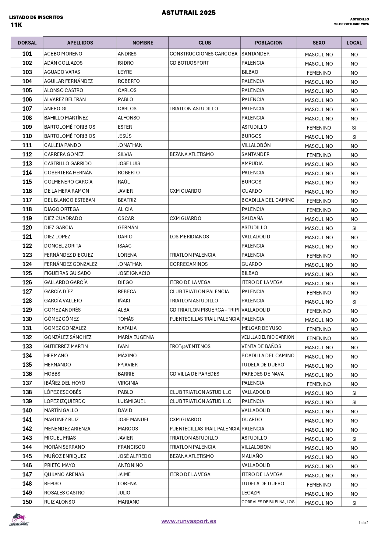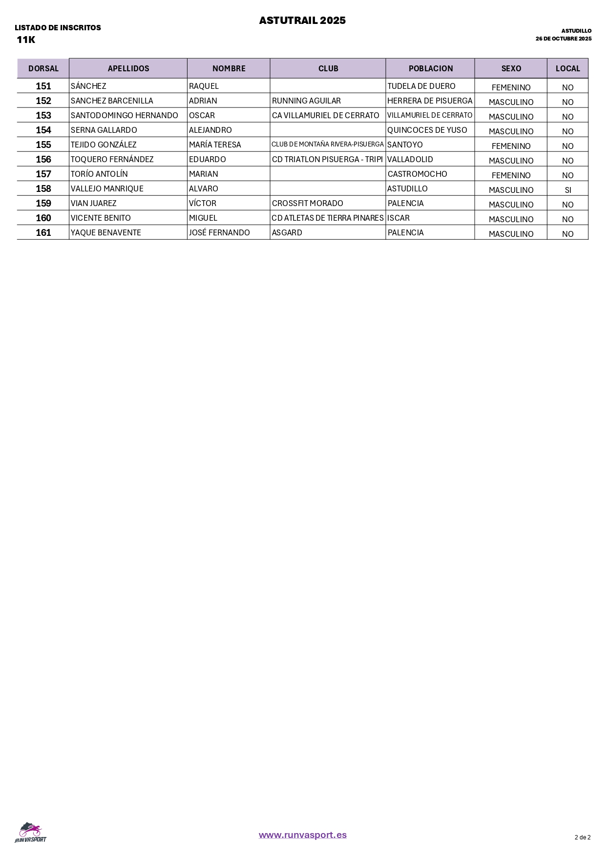 Listado de inscritos Trail corto 11k